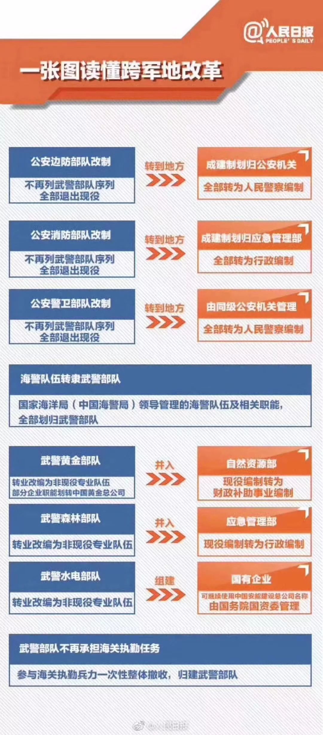 著眼全面落實(shí)黨對人民解放軍和其他武裝力量的絕對領(lǐng)導(dǎo),貫徹落實(shí)黨中央關(guān)于調(diào)整武警部隊(duì)領(lǐng)導(dǎo)指揮體制的決定,按照軍是軍、警是警、民是民原則,將列武警部隊(duì)序列、國務(wù)院部門領(lǐng)導(dǎo)管理的現(xiàn)役力量全部退出武警,將國家海洋局領(lǐng)導(dǎo)管理的海警隊(duì)伍轉(zhuǎn)隸武警部隊(duì),將武警部隊(duì)擔(dān)負(fù)民事屬性任務(wù)的黃金、森林、水電部隊(duì)整體移交國家相關(guān)職能部門并改編為非現(xiàn)役專業(yè)隊(duì)伍,同時撤收武警部隊(duì)海關(guān)執(zhí)勤兵力,徹底理順武警部隊(duì)領(lǐng)導(dǎo)管理和指揮使用關(guān)系。