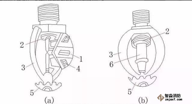 自動噴頭是閉式自動噴水滅火系統(tǒng)的關(guān)鍵組件,系通過熱敏感釋放機構(gòu)的動作而噴水。它由噴水口、溫感釋放器(控制器)和濺水盤組成,其形狀和樣式較多,下圖為常用的低熔點金屬控制器自動噴頭和爆炸瓶式自動噴頭。