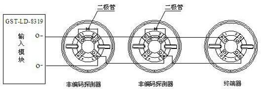 GST-LD-8319輸入模塊與非編碼探測器串聯(lián)連接時(shí),探測器的底座上應(yīng)接二極管1N5819,且輸出回路終端必須接GST-LD-8320或GST-LD-8320A終端器,終端器可當(dāng)探測器底座使用,即在此終端器上可安裝非編碼探測器,其系統(tǒng)構(gòu)成圖如圖2: