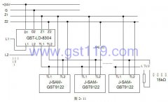 J-SAM-GST9122作為手動火災(zāi)報警按鈕及消防電話插孔使用時,將報警按鈕的Z1、Z2端子直接接入火災(zāi)報警控制器總線上,同時將報警按鈕的TL1、TL2端子與GST-LD-8304消防電話模塊連接,具體見圖2-11所示(最末端報警按鈕的TL1、TL2接線端子接4.7kΩ終端電阻)。