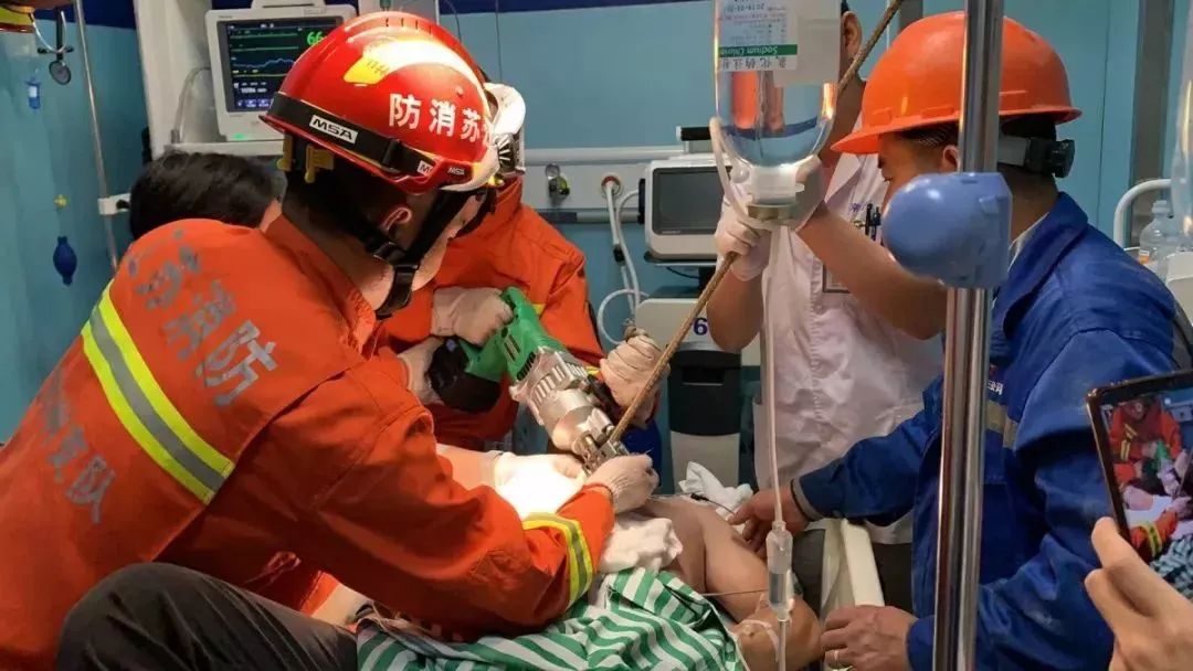 救援人員成功將鋼筋逐一切斷、分割,方便醫(yī)護(hù)人員進(jìn)行手術(shù),據(jù)悉,傷者現(xiàn)生命體征正常。