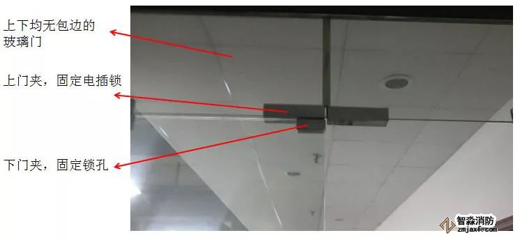 電插鎖是暗裝,要將鎖體埋入門框內(nèi),上圖是電插鎖最常見的安裝方式,要求玻璃門上下均有包邊