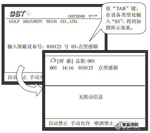 注意:在進(jìn)行消防主機(jī)“屏蔽”操作中輸入設(shè)備的編碼時(shí),可以使用通配符“*”,“*”代表這一位可以是0~9中的任意一個(gè)數(shù)字,這個(gè)功能可以方便的將一類設(shè)備取消屏蔽。例如:如果要屏蔽掉系統(tǒng)中所有的點(diǎn)型感煙火災(zāi)探測(cè)器,我們可以在屏蔽操作時(shí)輸入:“******”,“TAB”,“03”,這樣所有點(diǎn)型感煙火災(zāi)探測(cè)器將被屏蔽。其中“03”為點(diǎn)型感煙火災(zāi)探測(cè)器設(shè)備類型代碼。