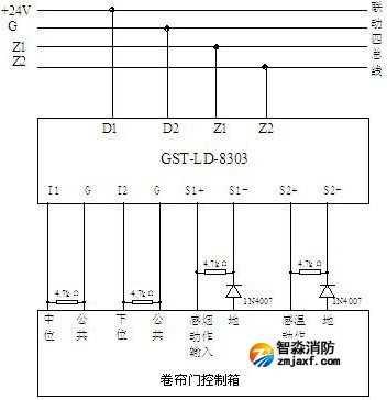 Z1、Z2:接火災(zāi)報(bào)警控制器信號(hào)二總線,無(wú)極性
