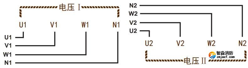監(jiān)測電壓輸入:電壓I和電壓Ⅱ:兩路獨立的三相四線電壓輸入;并接在被監(jiān)測電壓上,注意U、V、W、N線的順序及極性。