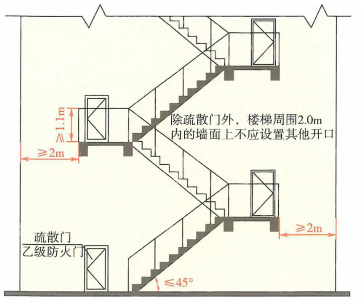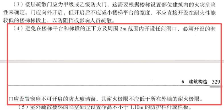 6.4.5-5除疏散門(mén)外,樓梯周?chē)?m內(nèi)的墻面上不應(yīng)設(shè)置門(mén)、窗、洞口。疏散門(mén)不應(yīng)正對(duì)梯段。