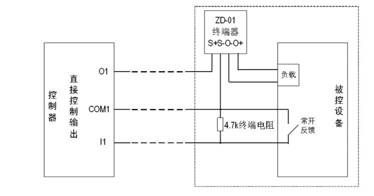 O、COM:組成直接控制輸出端,通過(guò)ZD-01終端器與負(fù)載連接,O為輸出端正極,COM為輸出端負(fù)極,啟動(dòng)后O與COM之間輸出DC24V。